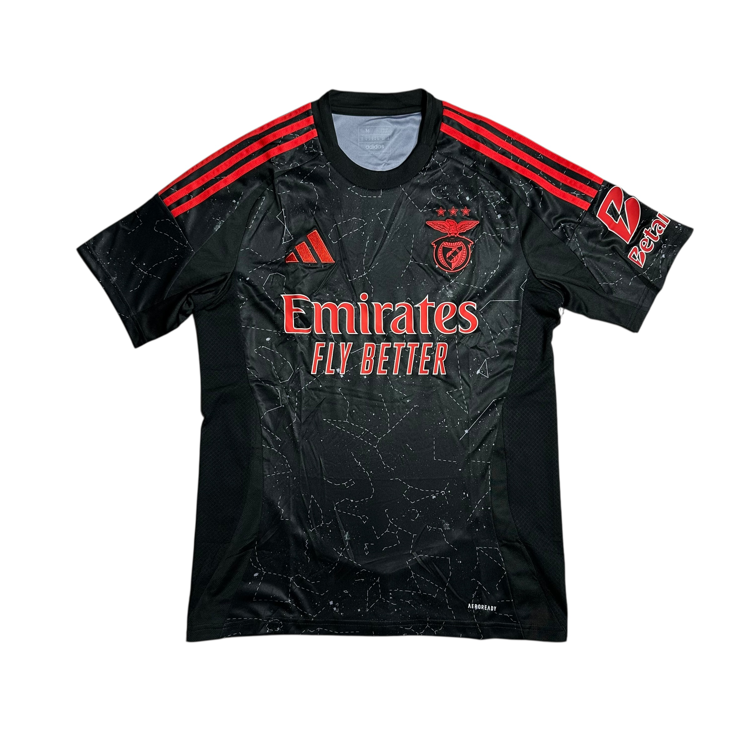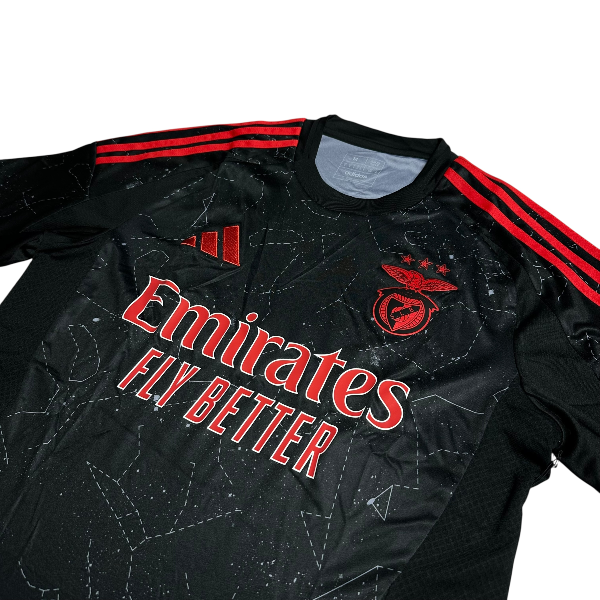 Przód zdobi logo sponsora Fly Emirates, białe logo Adidasa oraz haftowany herb SL Benfiki w klasycznych barwach – jeden z najładniejszych elementów koszulki. Delikatna tekstura na materiale dodaje jej głębi i premium-wykończenia.