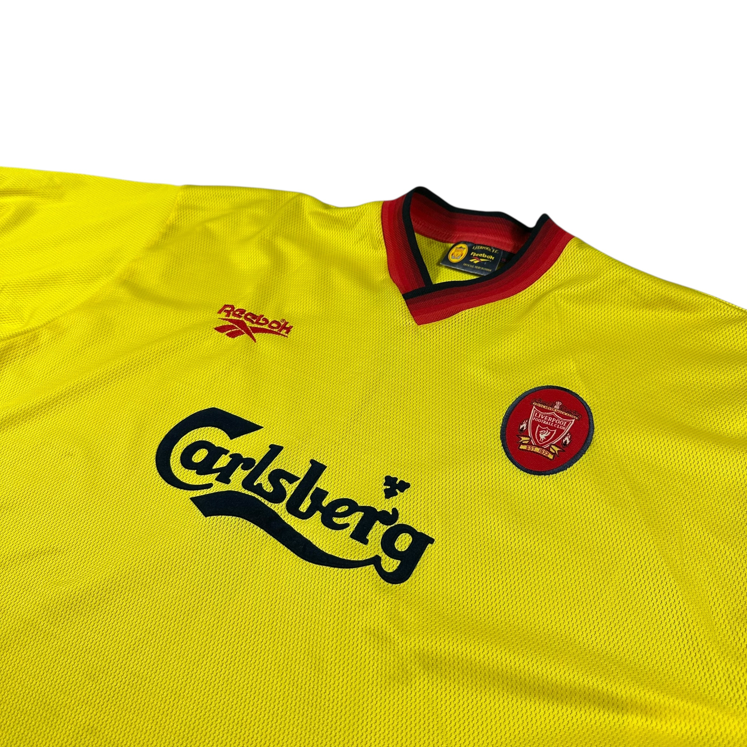 Oryginalna wyjazdowa koszulka Liverpoolu z sezonu 1997/1998 to projekt Reeboka w jasnożółtej kolorystyce z granatowymi detalami na kołnierzyku, rękawach i bokach. Na froncie znalazło się klasyczne logo sponsora Carlsberg, a haftowany herb klubu z wizerunkiem Liverbirda dopełniał całości. Krój koszulki utrzymany był w stylu charakterystycznym dla końcówki lat 90.