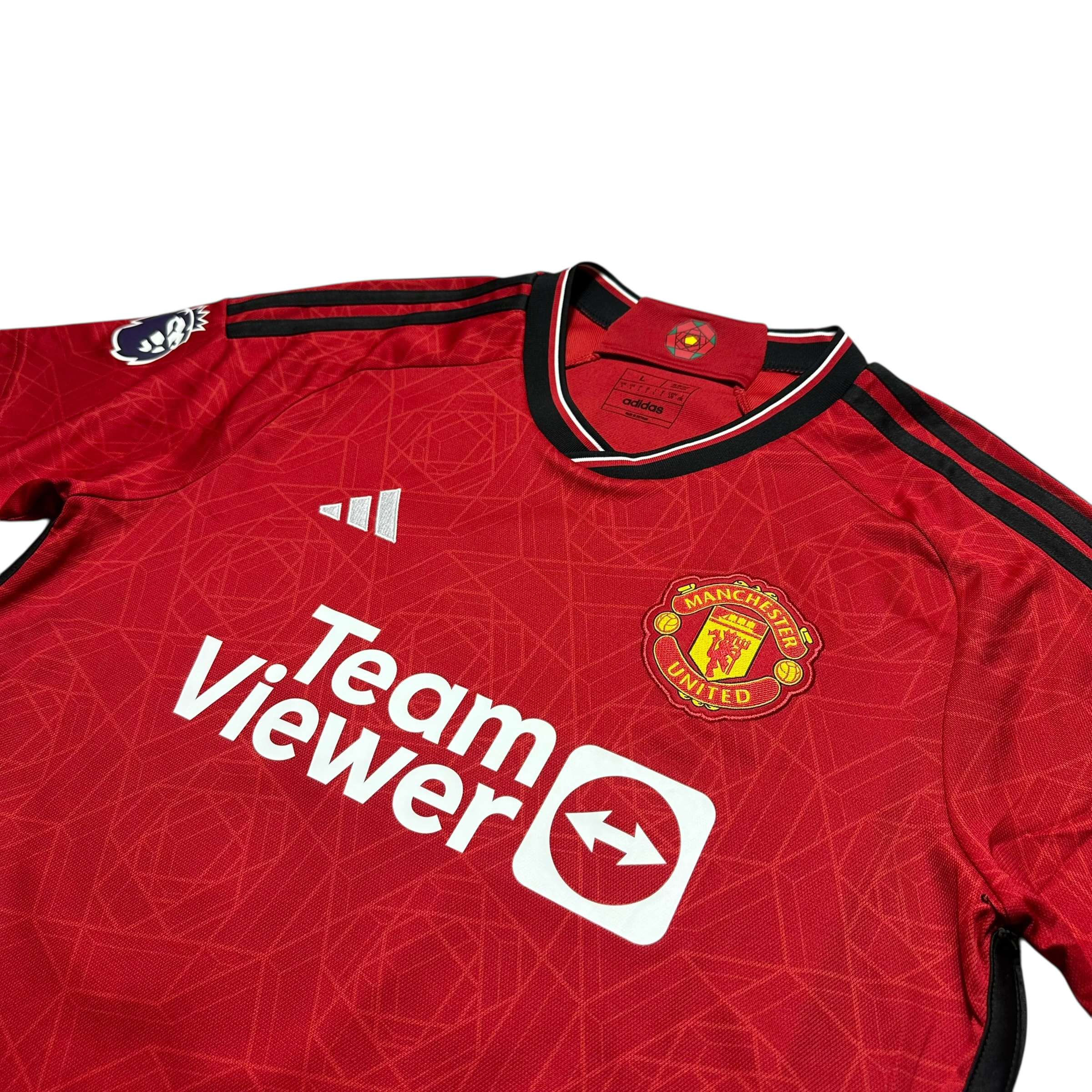 Na froncie znajduje się logo sponsora TeamViewer, białe logo Adidasa oraz haftowany herb Manchesteru United. Na plecach widnieje nadruk Casemiro z numerem 18. Koszulka posiada klasyczny, prosty krój i wykonana jest z lekkiego, oddychającego materiału AEROREADY, stosowanego w oficjalnych koszulkach meczowych Adidasa w sezonie 23/24.