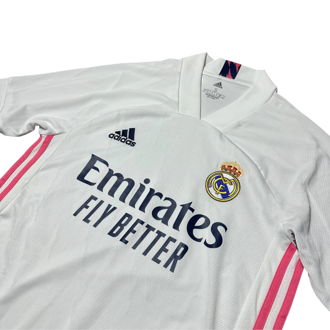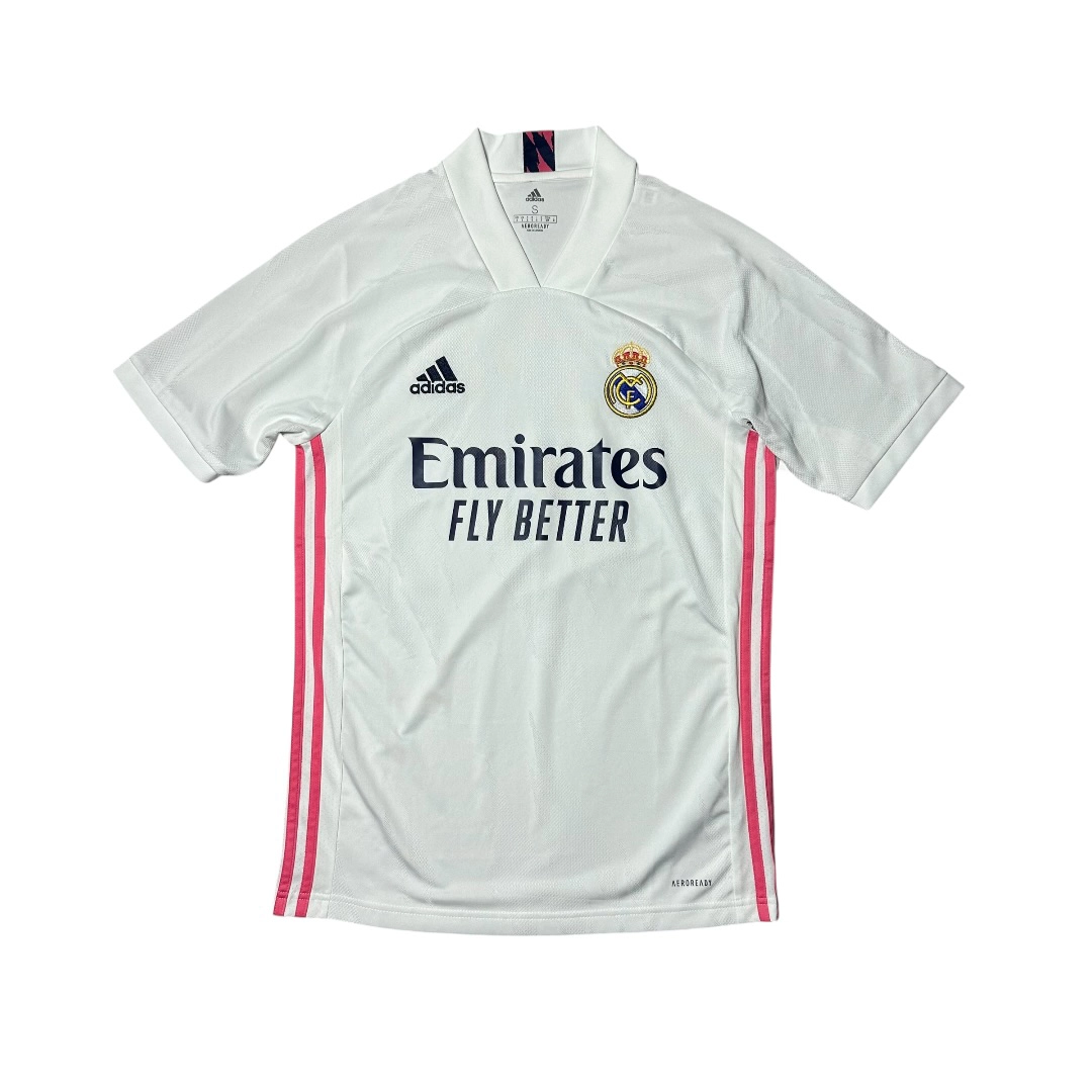 Home Kit Real Madrid 20/21 w rozmiarze S to ciekawa propozycja dla kolekcjonerów nowoczesnych koszulek La Liga, fanów Los Blancos oraz osób ceniących minimalistyczne, eleganckie projekty bez personalizacji.